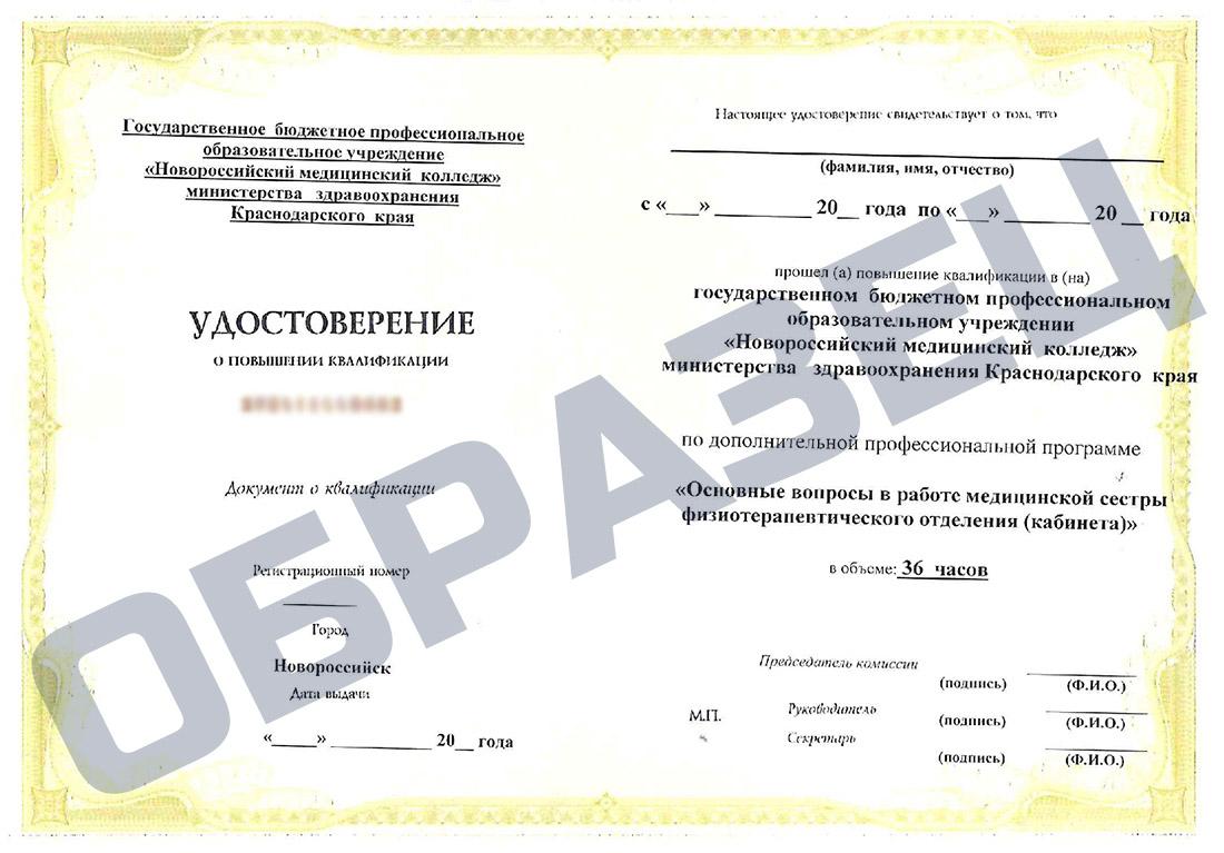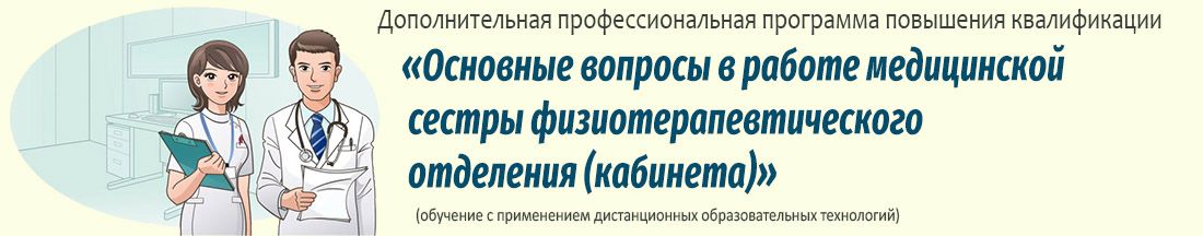 К обучению по программе повышения квалификации «Основные вопросы в работе медицинской сестры физиотерапевтического отделения (кабинета)» в объеме 36 часа по специальности «Физиотерапия», принимаются лица имеющие диплом о среднем медицинском образовании.