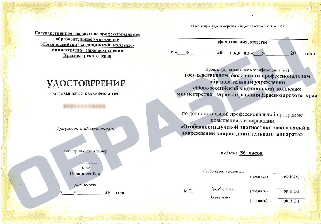 К обучению по программе повышения квалификации «Особенности лучевой диагностики заболеваний и повреждений опорно-двигательного аппарата» в объеме 36 часа по специальности «Рентгенология», принимаются лица имеющие диплом о среднем медицинском образовании.