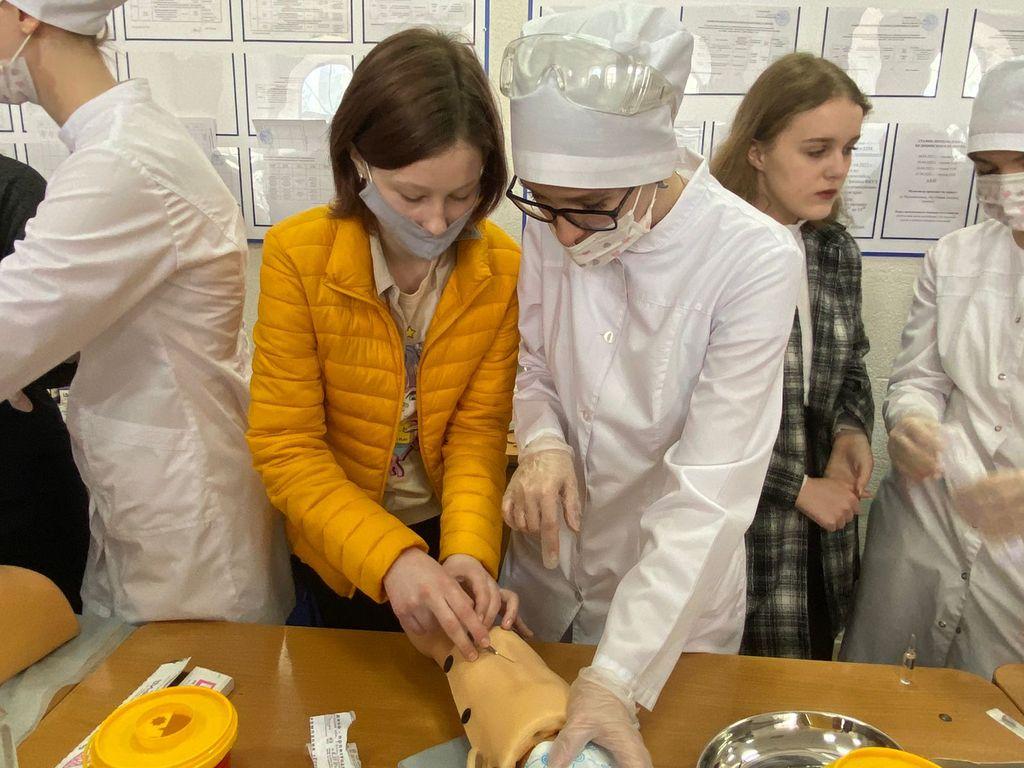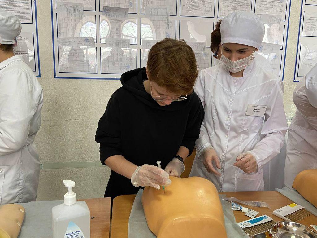 В холле колледжа студенты группы 22М под руководством преподавателя М.Г. Шохиной и Шапошниковой В.А. демонстрировали манипуляции внутривенной и внутримышечной инъекций, измерение артериального давления.